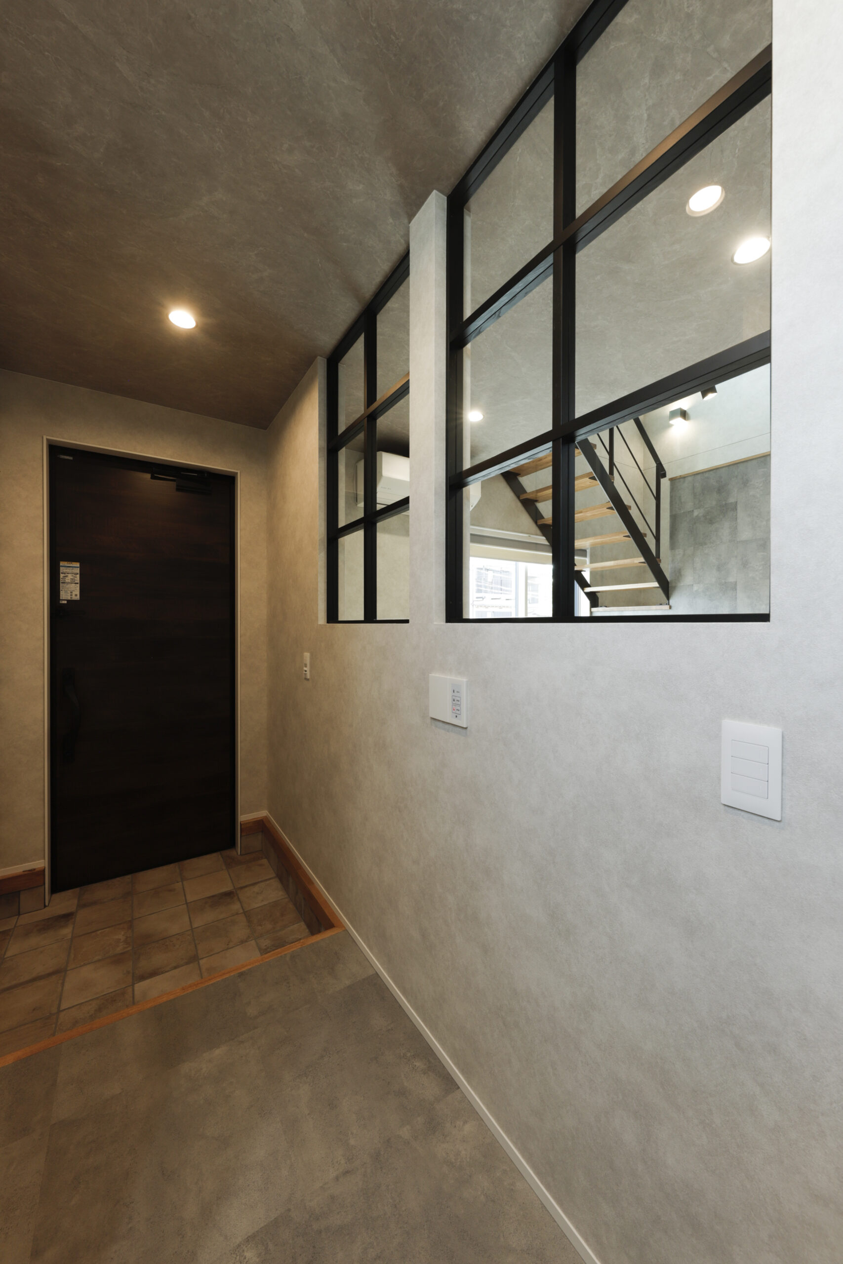 玄関に入ると真っ先に目を引く、リビングの室内窓。